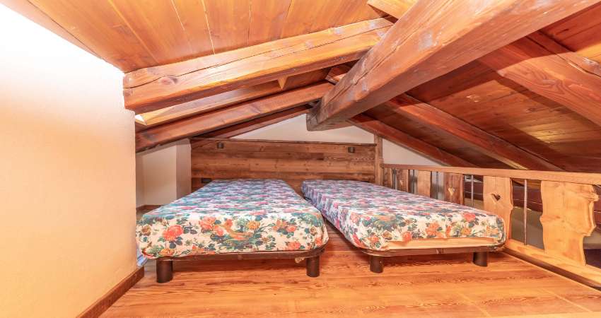 This apartment for two people is furnished in a simple and minimalist style but equipped with all the necessary amenities. The accommodation consists of a living area with a sofa bed, a dining area, a kitchenette with an induction hob and refrigerator, a bedroom with a double bed and a wardrobe, a loft with two single beds and a bathroom with a shower.