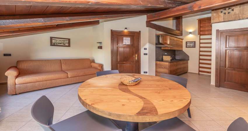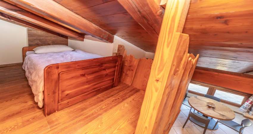 This apartment for two people is furnished in a warm and cosy Alpine style. The accommodation consists of a living area with a sofa bed, a dining area, a kitchenette with an induction hob and fridge, a bedroom with a double bed and a wardrobe, a loft with two single beds and a bathroom with a shower.