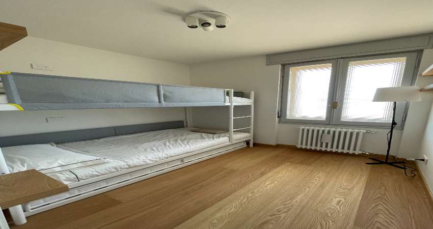 Two bedroom apartment - This apartment consists of a living area with a sofa, a dining area with a table and chairs, a kitchenette with a refrigerator and stovetop, two bedrooms, one with a double bed and a bunk bed, and a bathroom with a bathtub and washing machine. (Photos from 9 to 13)