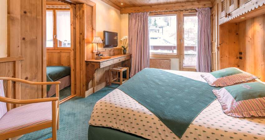 This hotel offers bright and welcoming rooms, suites, and apartments, furnished in a traditional Alpine style, with wood-paneled walls that create a typical mountain atmosphere.