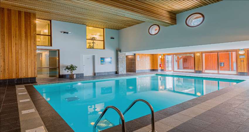 The apartment building has a heated indoor swimming pool available for guests' use.