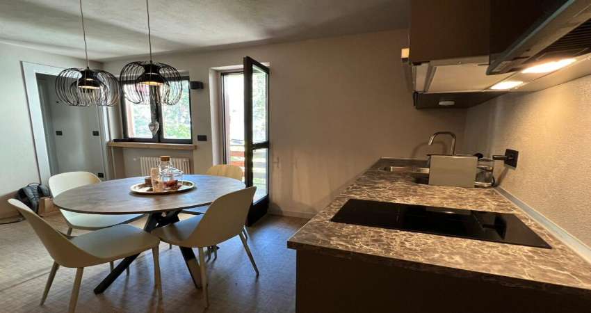 This apartment features a living area with a sofa bed for two, a small dining area seating four, a modern kitchen with an induction stovetop, refrigerator, dishwasher, and coffee maker, a bedroom with a double bed, and a bathroom with a shower. The apartment boasts a beautiful balcony with views of the surrounding mountains.