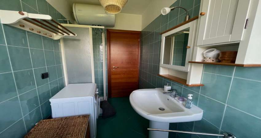 The apartment consists of a living area with a sofa, a dining area, a kitchen with a stove, a refrigerator, and a dishwasher, a bedroom with a double bed, a bedroom with a bunk bed, and a bathroom with a shower. The bathroom also features a washing machine for guests' use. The unit boasts a lovely balcony with a view.